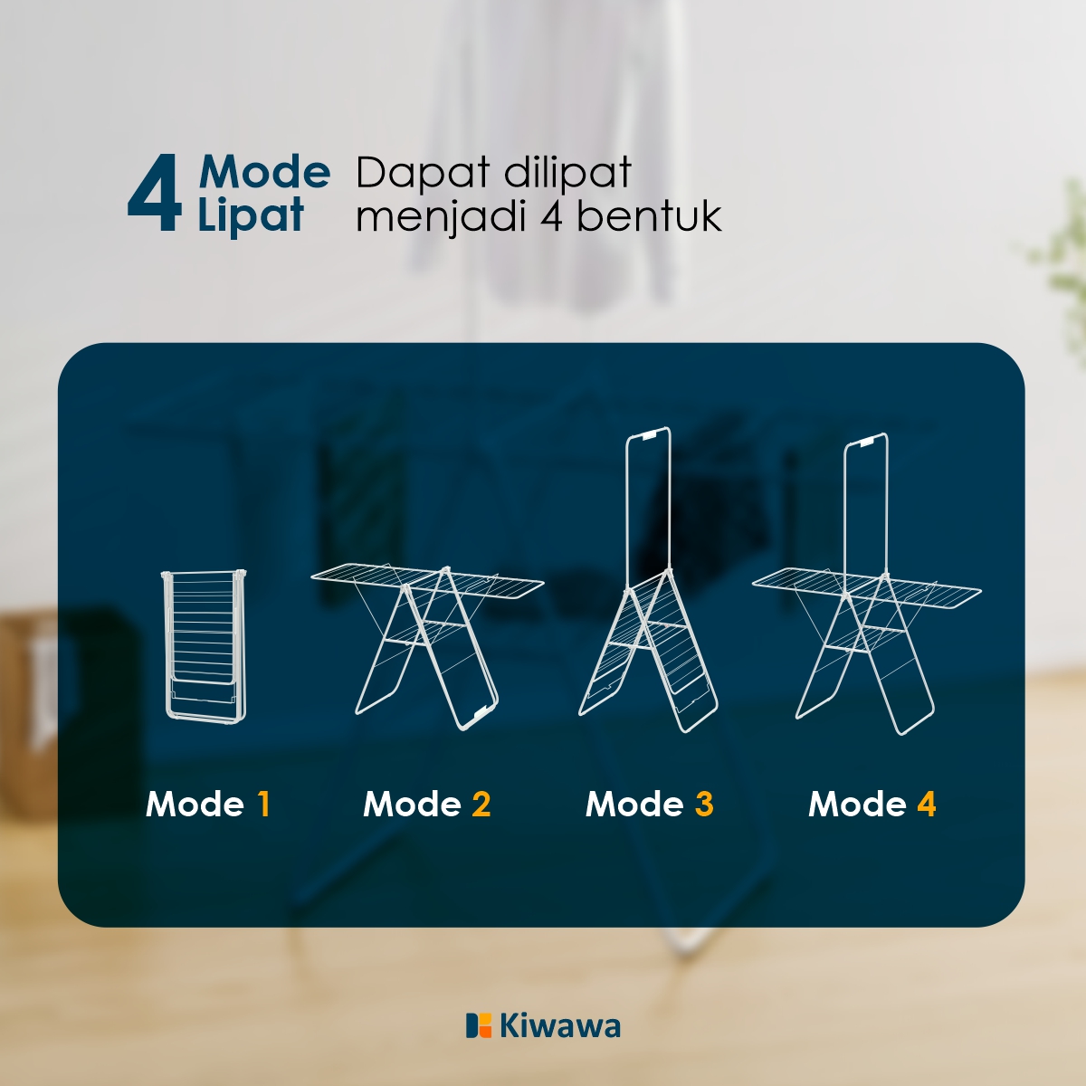 Dengan desain lipat 4 mode fleksibel, Anda bisa sesuaikan ukuran sesuai kebutuhan – dari jemuran lantai indoor hingga outdoor di balkon. Portable banget, mudah dibawa saat pindah rumah atau traveling. Hemat ruang, hemat waktu, dan hemat energi – ideal untuk pasutri baru yang ingin rumah rapi tanpa ribet.